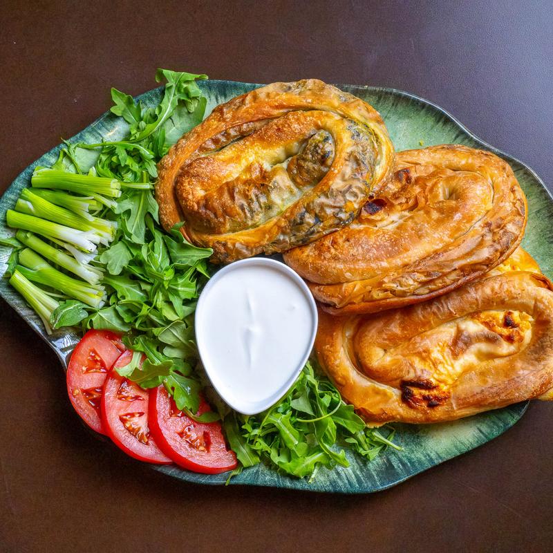 Plum chutney, brie cheese, arugula, roasted red peppers, zucchini, fennel, shallots, and squash.